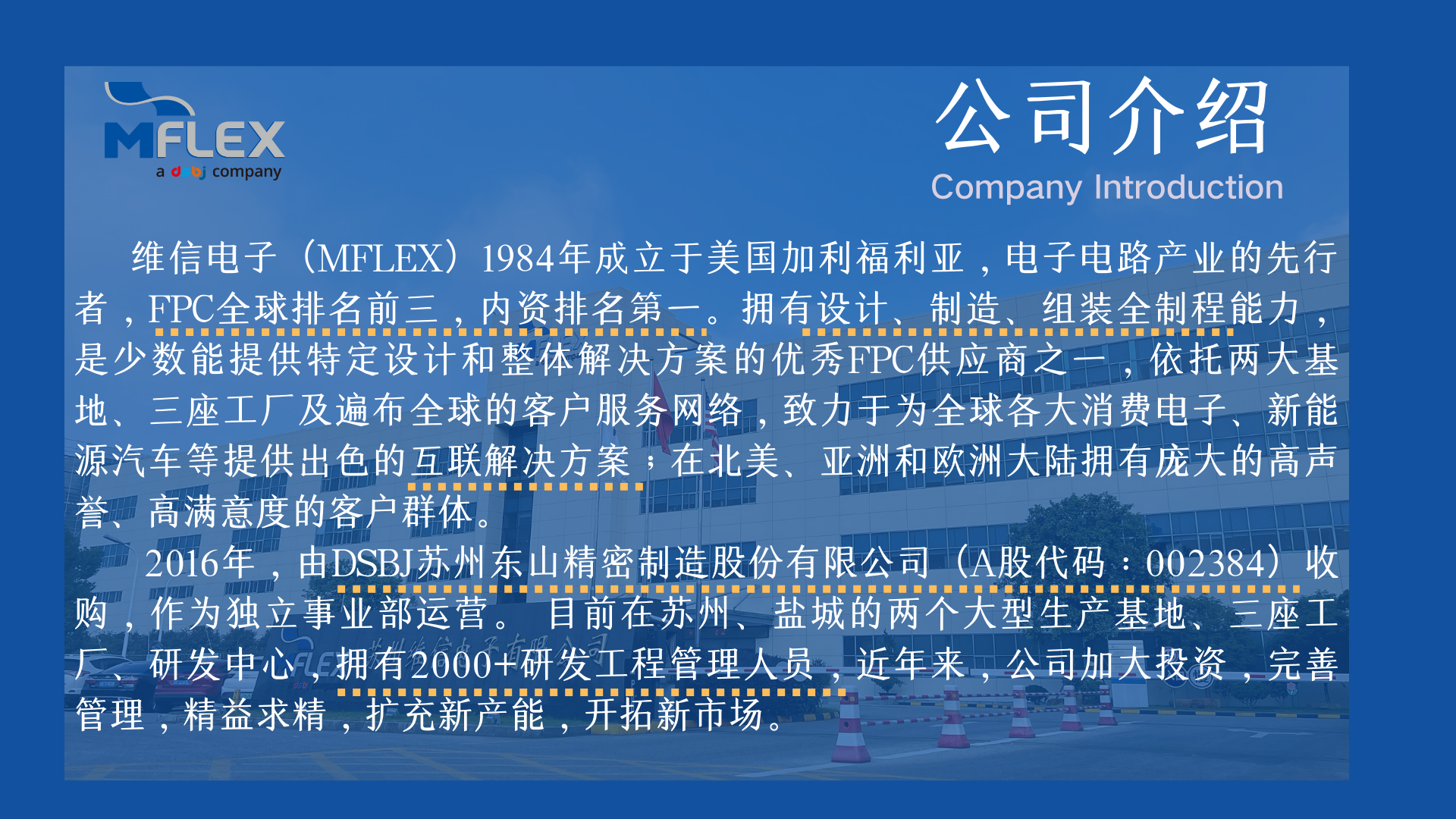 维信电子(MFLEX)1994年来华投资,目前在苏州、盐城拥有两个大型生产基地、三座工厂、研发中心,拥有超过2000+研发工程管理人员,员工近万人。近五年来,公司加大投资,完善管理,精益求精,扩充新产能,开拓新市场。2016年被东山精密集团收购后,营收数倍提速增长,目前是FPC行业全球排名前三、国内同行业排名第一的超大型制造商。